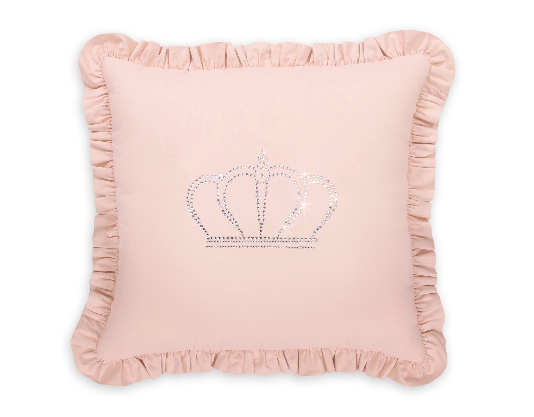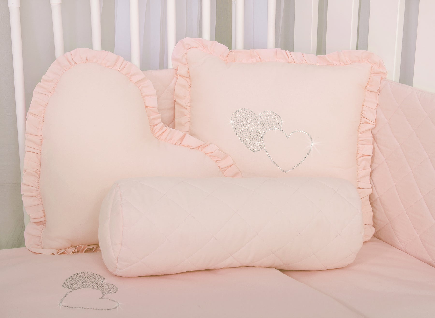 Elegant kussen met applicatie. Versierd met een franje. De kussensloop valt op door een glinsterende applicatie van fijne zirkonen op gladde katoenen stof. Buitenstof van 100% katoen (niet demontabel). De vulling in het kussen is Eco Fillball-geteste siliconenballen - "kunstmatige pluisjes" voor kussens - vulling zorgt voor een goede afwikkeling van de baby en luchtcirculatie. Het zal uitstekend werken als decoratie van de kinderkamer. Het kussen is een geheel, zonder afneembare kussensloop. Het is een prachtige set met ons beddengoed.
