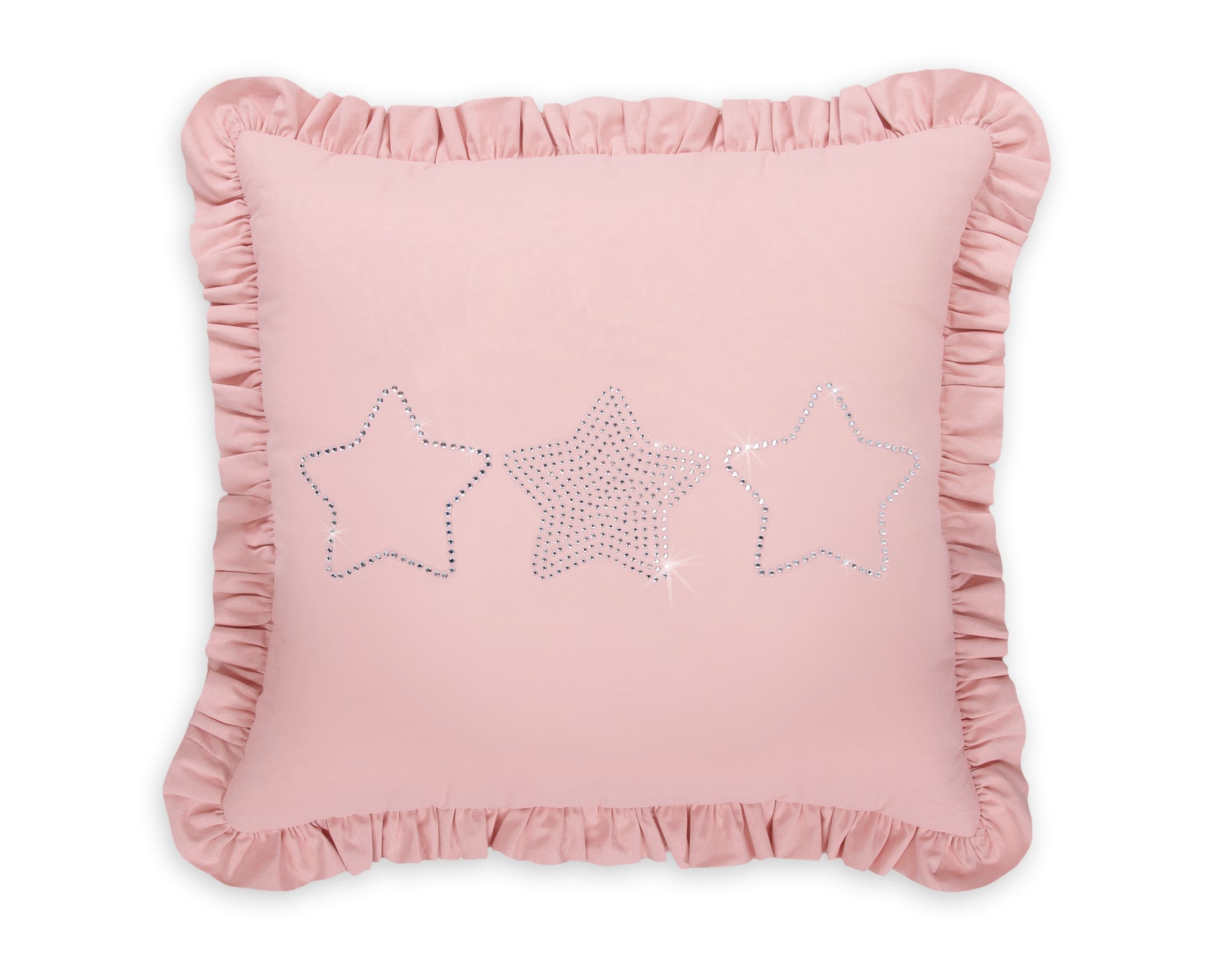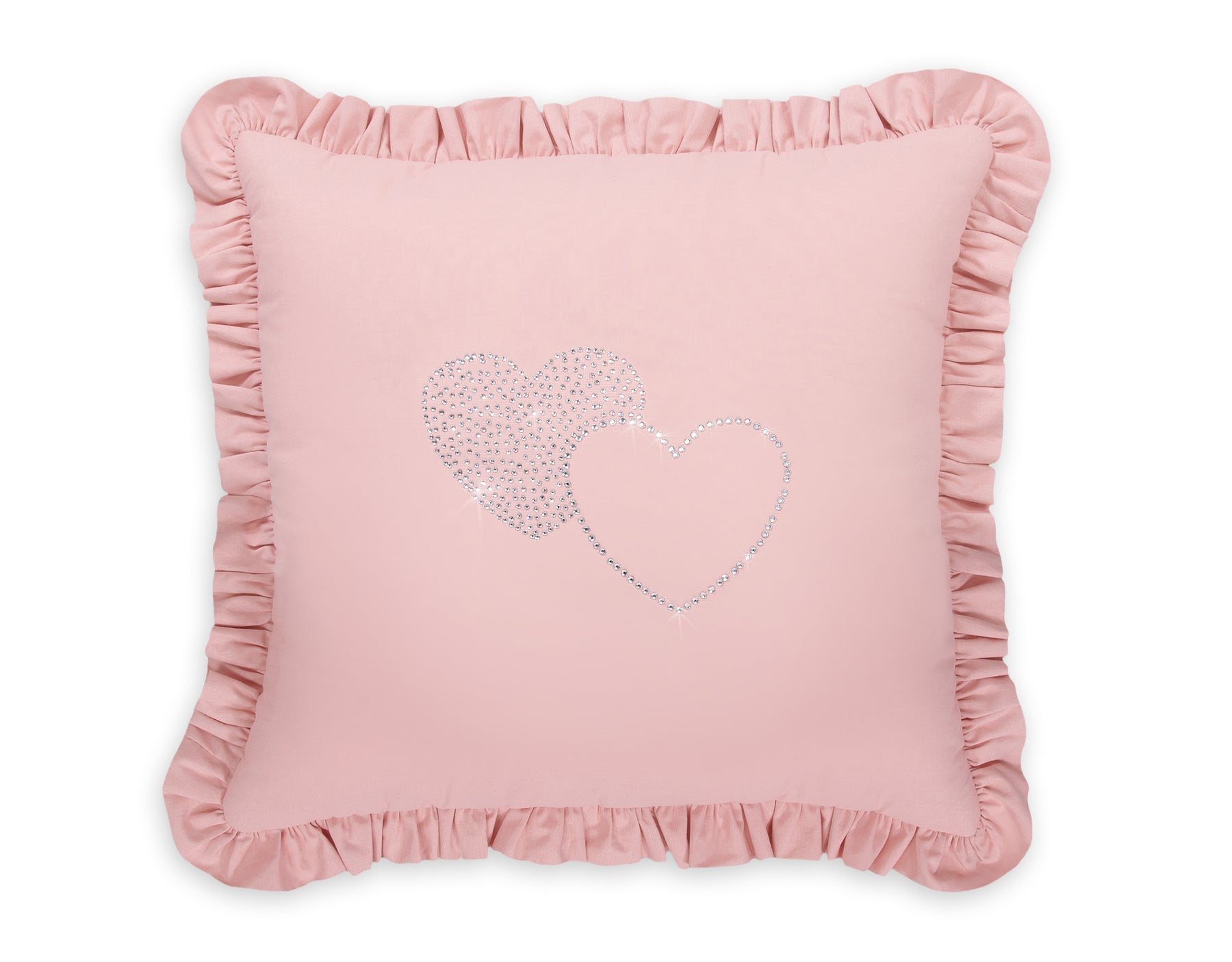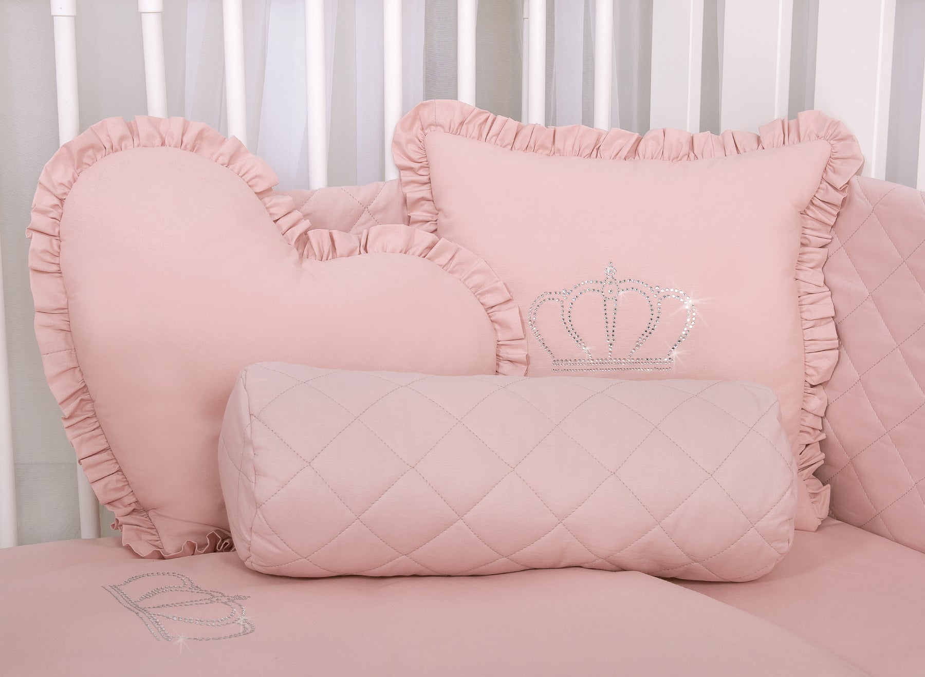 Elegant kussen met applicatie. Versierd met een franje. De kussensloop valt op door een glinsterende applicatie van fijne zirkonen op gladde katoenen stof. Buitenstof van 100% katoen (niet demontabel). De vulling in het kussen is Eco Fillball-geteste siliconenballen - "kunstmatige pluisjes" voor kussens - vulling zorgt voor een goede afwikkeling van de baby en luchtcirculatie. Het zal uitstekend werken als decoratie van de kinderkamer. Het kussen is een geheel, zonder afneembare kussensloop. Het is een prachtige set met ons beddengoed.