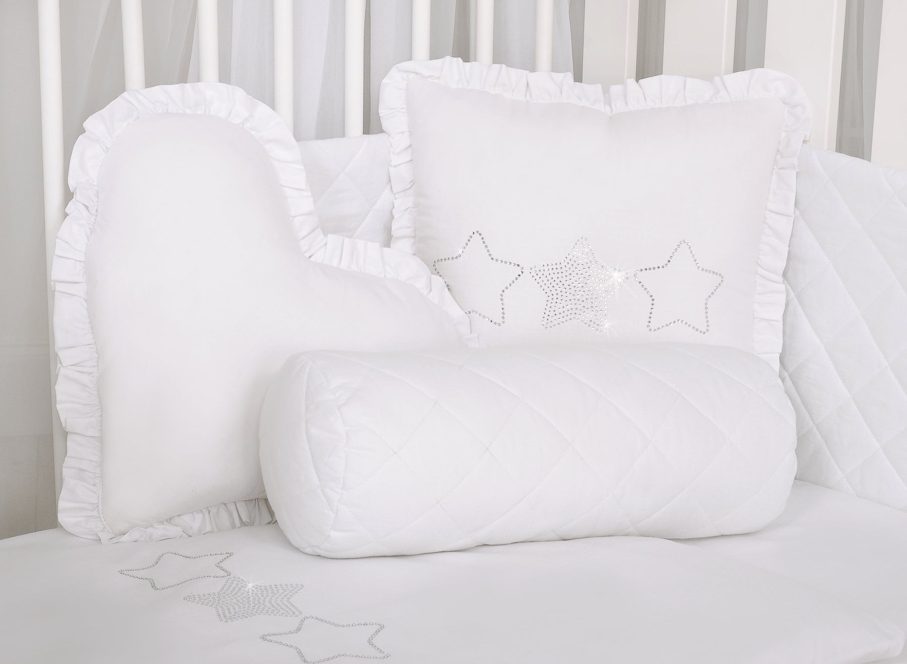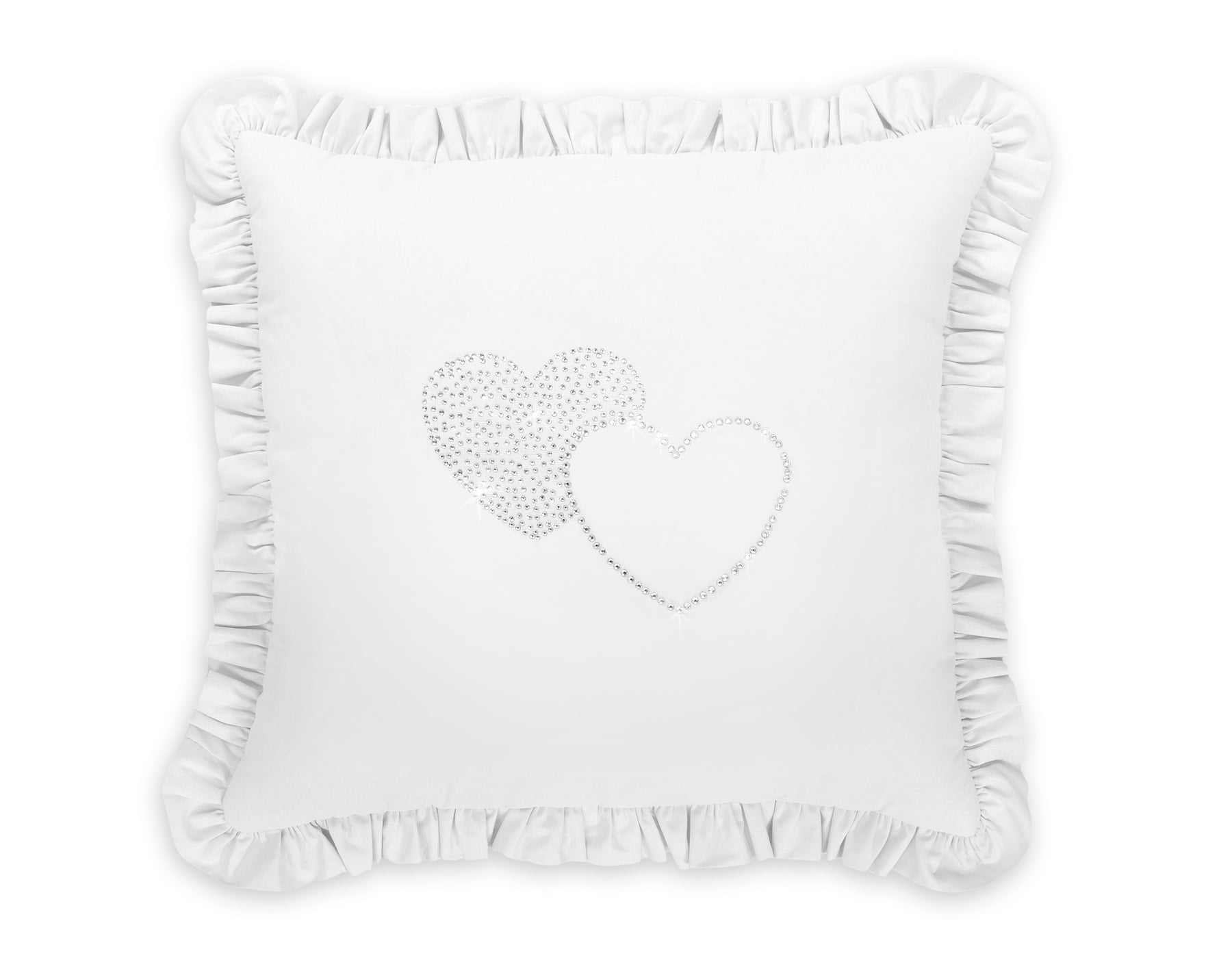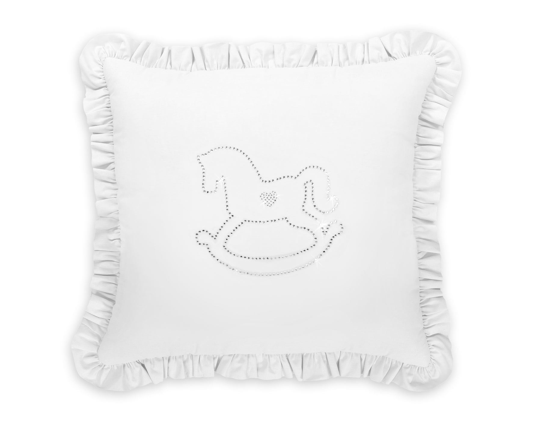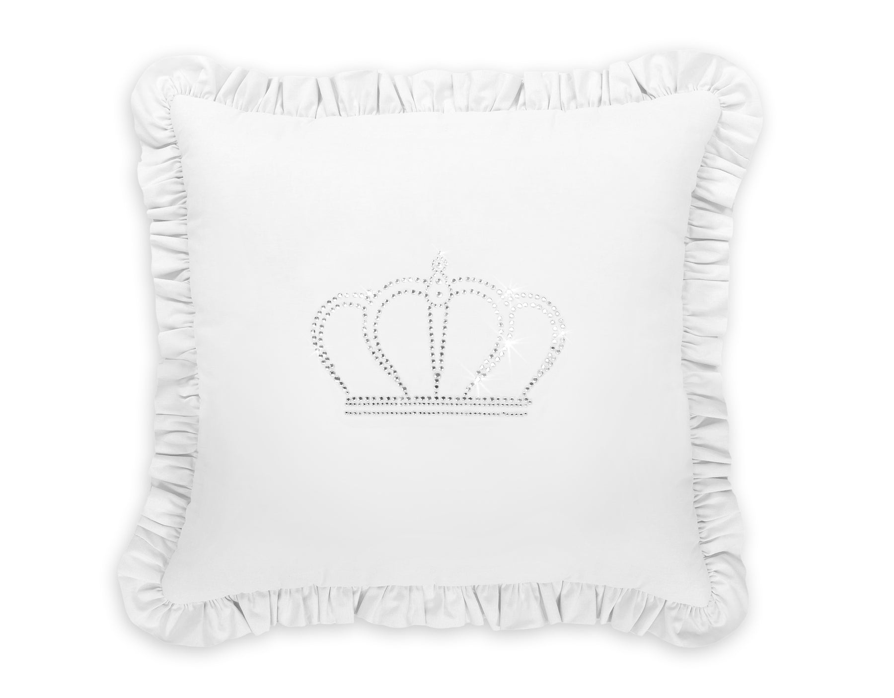 Elegant kussen met applicatie. Versierd met een franje. De kussensloop valt op door een glinsterende applicatie van fijne zirkonen op gladde katoenen stof. Buitenstof van 100% katoen (niet demontabel). De vulling in het kussen is Eco Fillball-geteste siliconenballen - "kunstmatige pluisjes" voor kussens - vulling zorgt voor een goede afwikkeling van de baby en luchtcirculatie. Het zal uitstekend werken als decoratie van de kinderkamer. Het kussen is een geheel, zonder afneembare kussensloop. Het is een prachtige set met ons beddengoed.