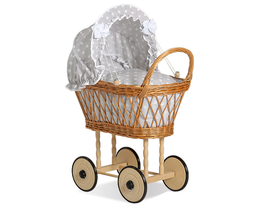 Rieten poppenwagen met grijs beddengoed en vulling - naturel