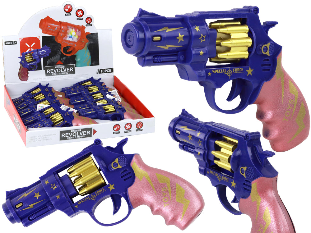 Blauw en roze revolvergeweer met wapengeluiden van licht. Dit dynamische en kleurrijke speelgoedpistool zal zeker de aandacht trekken van jonge avonturiers. In aantrekkelijke pink en marineblauwe kleuren met gouden accenten, valt het wapen op tussen andere speeltjes. Perfect voor spannende rollenspellen en het stimuleren van de fantasie van kinderen. Een uniek cadeau voor elke kleine held.