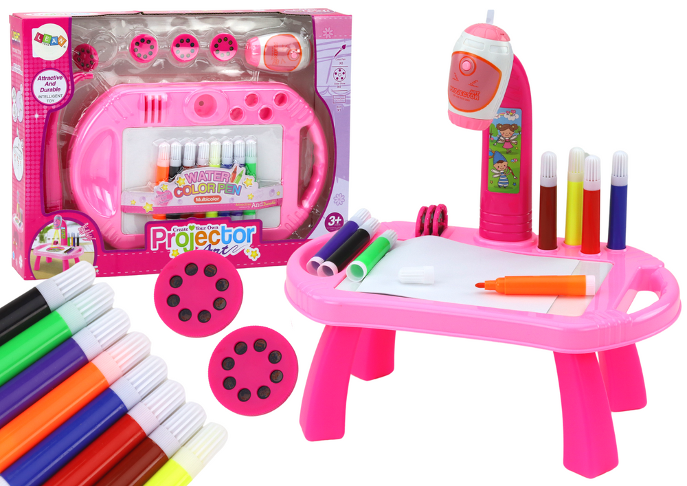Met de Projector Voor Tekentafel in de kleur roze kunnen kinderen hun creativiteit de vrije loop laten. Dit innovatieve schilder- en tekenprojector biedt een verstelbare positie en bevat 32 leuke afbeeldingen om mee aan de slag te gaan. Inclusief 8 gekleurde stiften en een notitieboek is het perfect voor ontwikkeling, plezier en creativiteit. Dit maakt het een geweldig cadeau voor jonge kunstenaars die hun vaardigheden willen verbeteren en plezier willen beleven aan tekenen en schilderen. Laat de fantasie van je kind tot leven komen met deze veelzijdige projector.