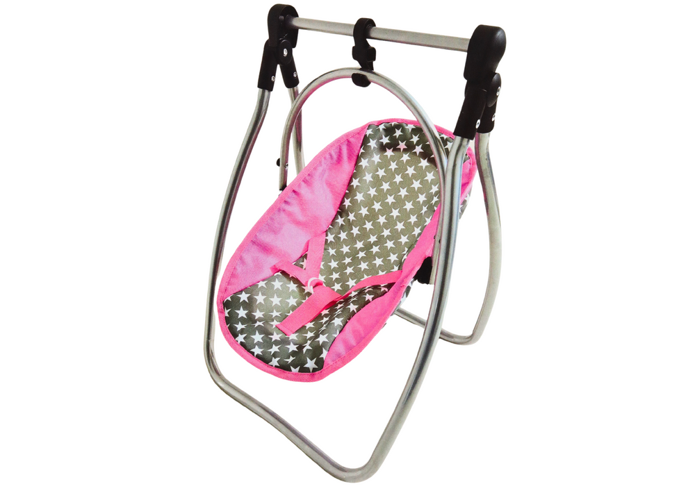 De Poppenschommel Eetstoel Alice Stars in Grijs-Roze is de perfecte speelaccessoire voor kleine poppenmoeders. Met stevige aluminium poten en kunststof verbindingen biedt deze schommel duurzame ondersteuning voor urenlang speelplezier. Het stijlvolle ontwerp van grijze stof met witte sterren en roze strepen past perfect in elke kinderkamer. Deze veelzijdige schommel kan eenvoudig worden omgevormd van een schommel naar een eetstoel, zodat je poppen altijd comfortabel kunnen zitten tijdens hun maaltijden of ontspanning. Een ideaal cadeau voor creatief en actief spel!