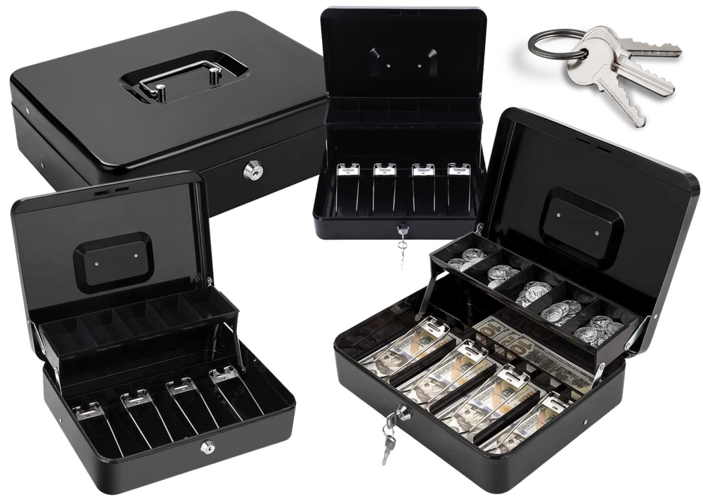 Kassa voor bankbiljetten en munten, gemaakt van hoogwaardig plaatstaal, biedt een compacte en veilige oplossing voor het opslaan van geld. Deze metalen kassa is uitgerust met 5 compartimenten voor munten en 4 bankbiljetklemmen, waardoor je je financi�n eenvoudig kunt organiseren. De kassa heeft een tweepositie slot voor extra beveiliging en een stevige metalen handgreep voor gemakkelijk transport. Ideaal voor gebruik op locaties met beperkte ruimte.