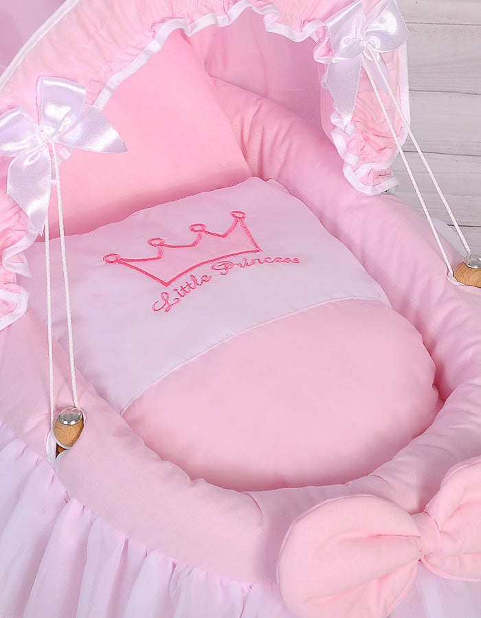MY SWEET BABY rieten wieg voor poppen zijn prachtige producten van de hoogste kwaliteit voor kinderen. Gemaakt van natuurlijk riet (wilg) en hout. Elk detail is prachtig genuanceerd als resultaat van zorgvuldig handwerk. Lange voering tot aan de grond, extra franjes en vooral een grote kroon en de inscriptie "Little Princess" op de quilt zijn de belangrijkste voordelen van deze prachtige poppenwiegjes. Perfect cadeau voor een klein meisje.