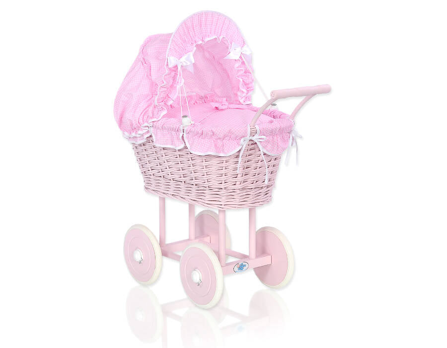 Rieten poppenwagen - gemaakt van natuurlijk riet, op een natuurlijk hoog houten onderstel met houten wielen - roze gelakt.