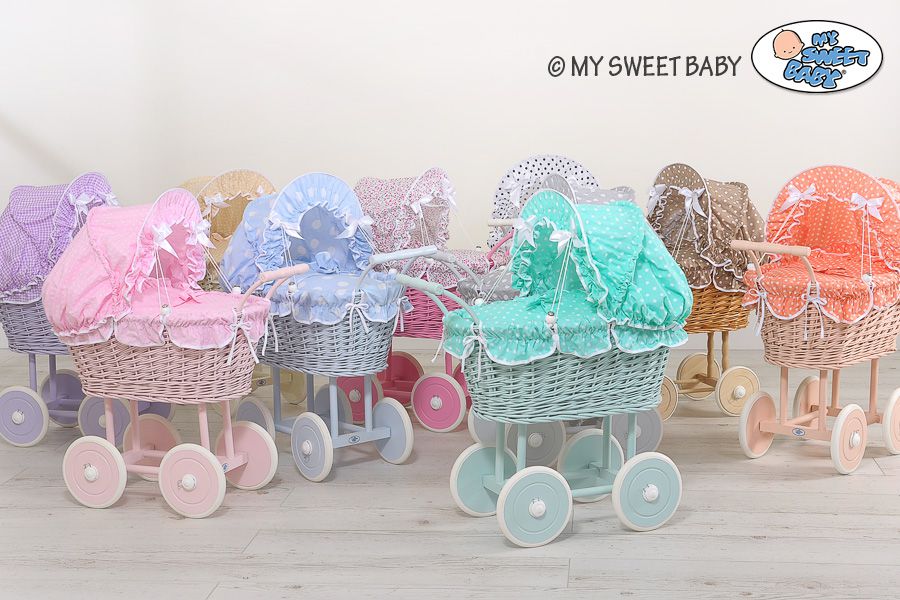 Een geweldig cadeau voor een klein meisje: een prachtige rieten poppenwagen MY SWEET BABY, stijlvol en uniek. Handgemaakte kinderwagen, handwerk van topkwaliteit. Natuurlijk Pools vlechtwerk uit ecologische teelt. De kinderwagen heeft een mooie ronde vorm. Houten massief onderstel van natuurlijk beukenhout, topkwaliteit. Dankzij het stevige, stabiele handvat kunt u de kinderwagen gemakkelijk en comfortabel besturen. Hoog onderstel comfortabel voor een ouder kind. Houten wielen beschermd door rubberen band. De wielen zijn gemonteerd op metalen assen. Een speciaal "klik-klak"-veiligheidssysteem zet de wielen stevig vast en zorgt ervoor dat de wielen gemakkelijk kunnen draaien.
