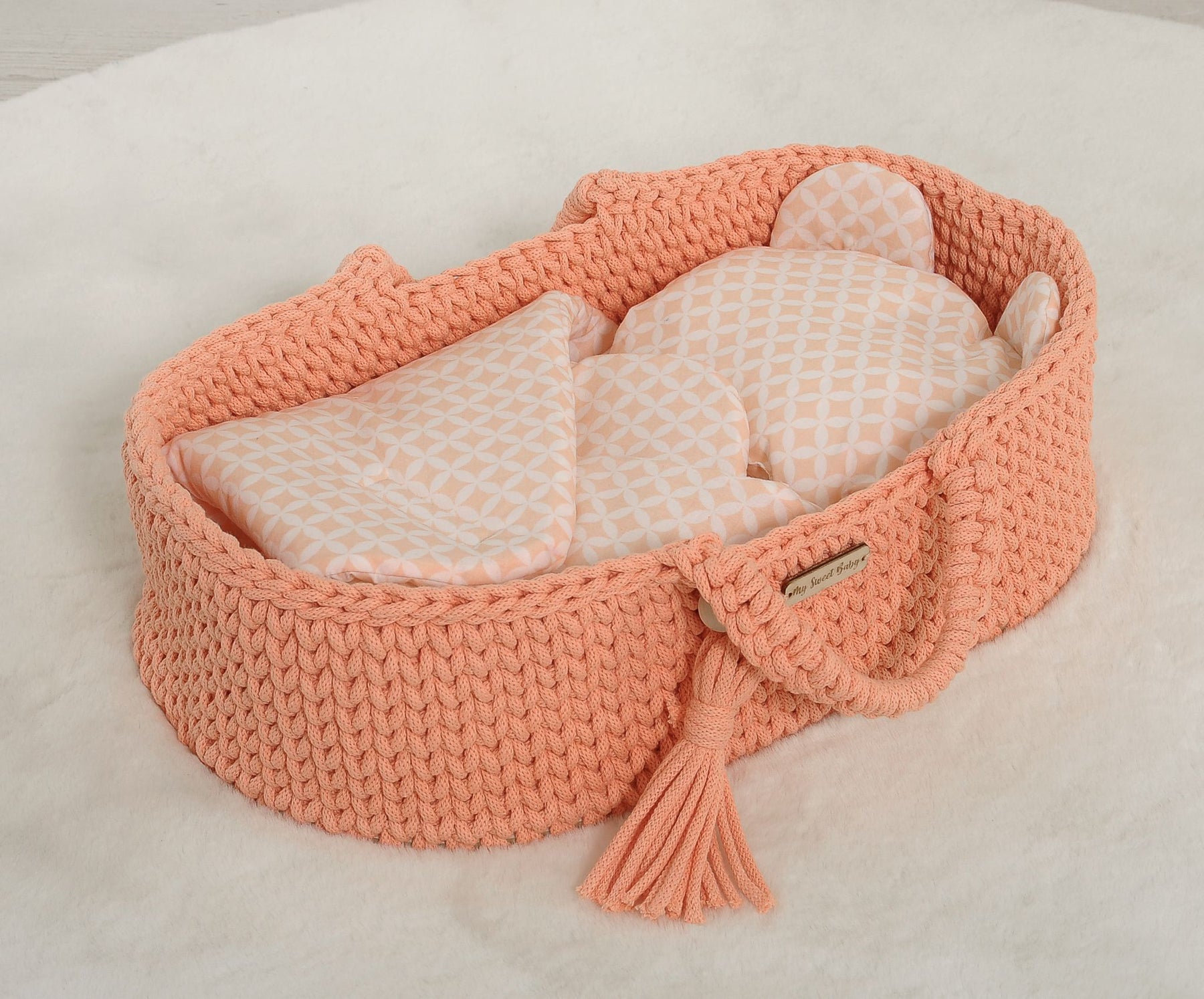 De set bevat ook een rond kussen met oren, in de vorm van het hoofd van een teddybeer. Een schattige set voor heerlijk poppenspel.