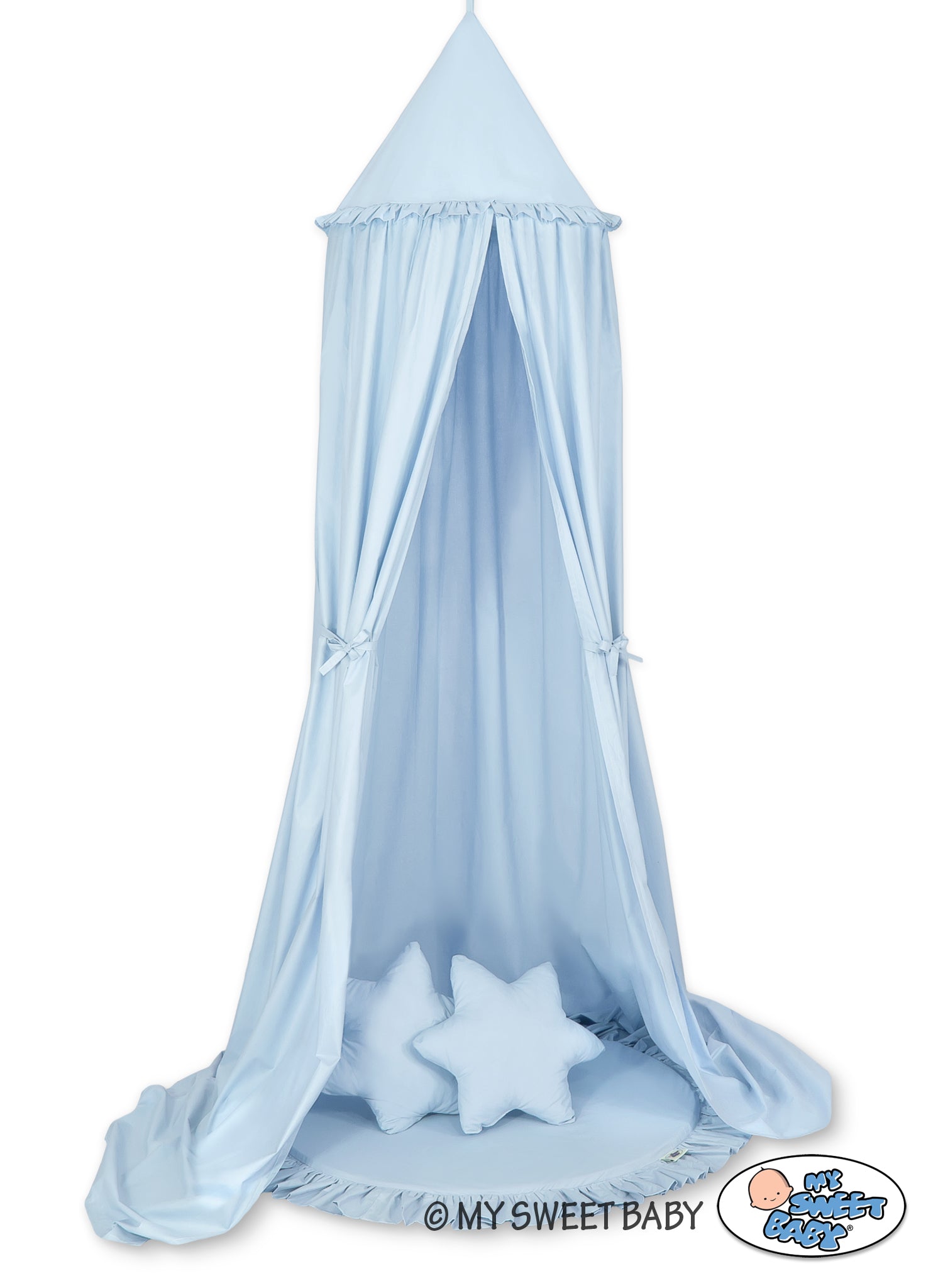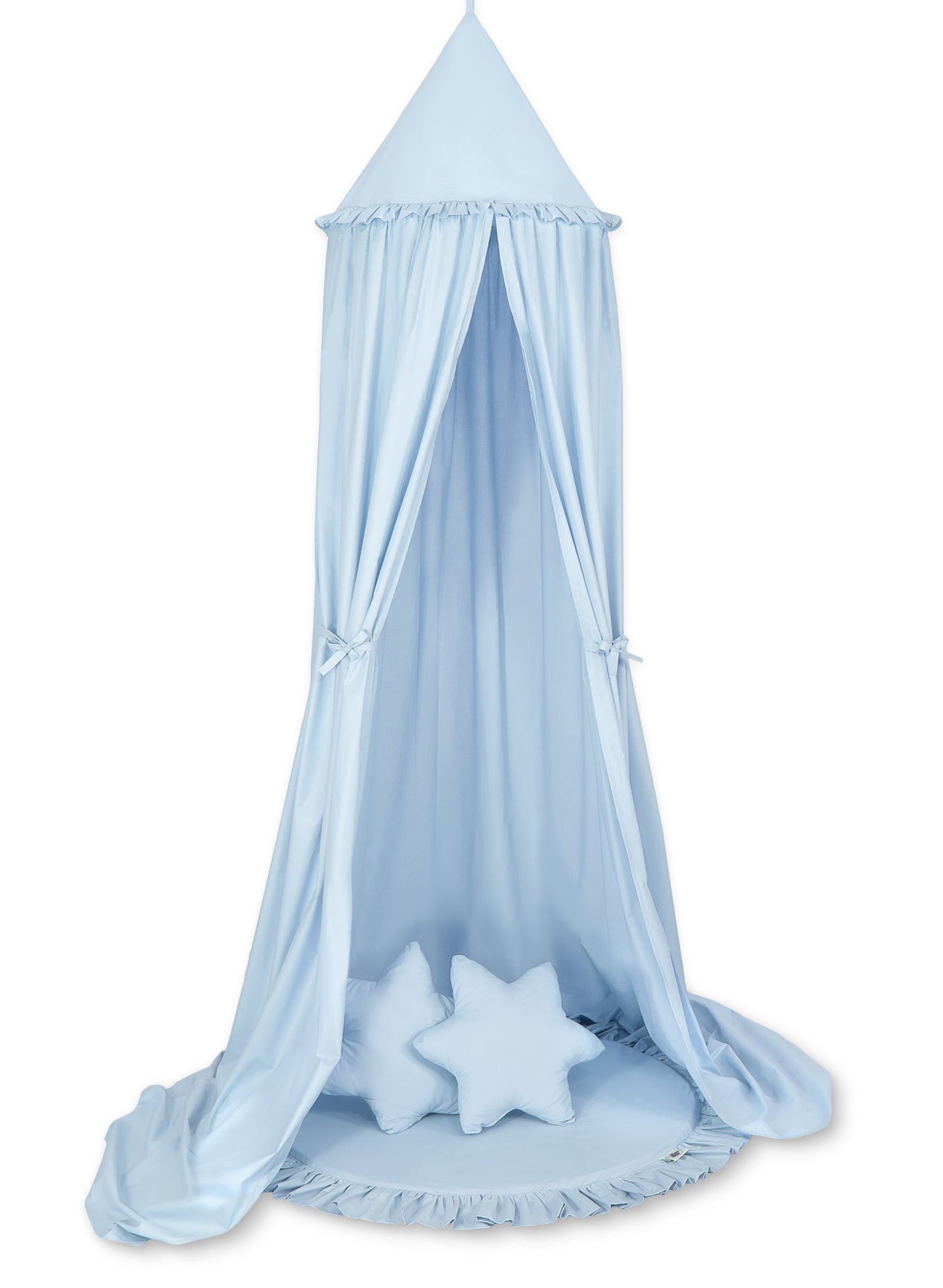 Een effectieve, langhangende luifel. Een prachtig element in de kinderkamer. Het kan gebruikt worden als unieke decoratie van een babybedje, maar het kan ook een prachtige plek om te spelen. Door over het bedje te hangen, wordt de luifel beschermd tegen veel licht en lawaai, waardoor een knusse sfeer ontstaat. en veilige plek om te rusten in het bedje. De luifel kan eenvoudig aan het plafond worden gemonteerd. De lengte van 260 cm maakt het mogelijk om de afgrond op de vloer te plaatsen. ontstaat een perfecte verstopplek en speelplek voor oudere kinderen. De luifel is gemaakt van Okotex-gecertificeerde, 100% katoenen stof. Aan de toegestane zitten praktische linten om de luifel vast te binden en zo een mooie tent te creëren. De rand aan de bovenzijde kan verwijderd worden. De stof is wasbaar op 30 graden. Gecombineerd met een zachte en comfortabele vloermat wordt het een perfecte plek voor plezier. De mat heeft een zachte vulling die perfect isoleert van de harde en koude vloer. De hoes is gemaakt van OKOTEX-gecertificeerd 100% katoen. De onderkant van het speelkleed is gemaakt van een modern, anti-allergisch, gecertificeerd materiaal. De onderkant kan worden verwijderd en de hoes kan worden gewassen.