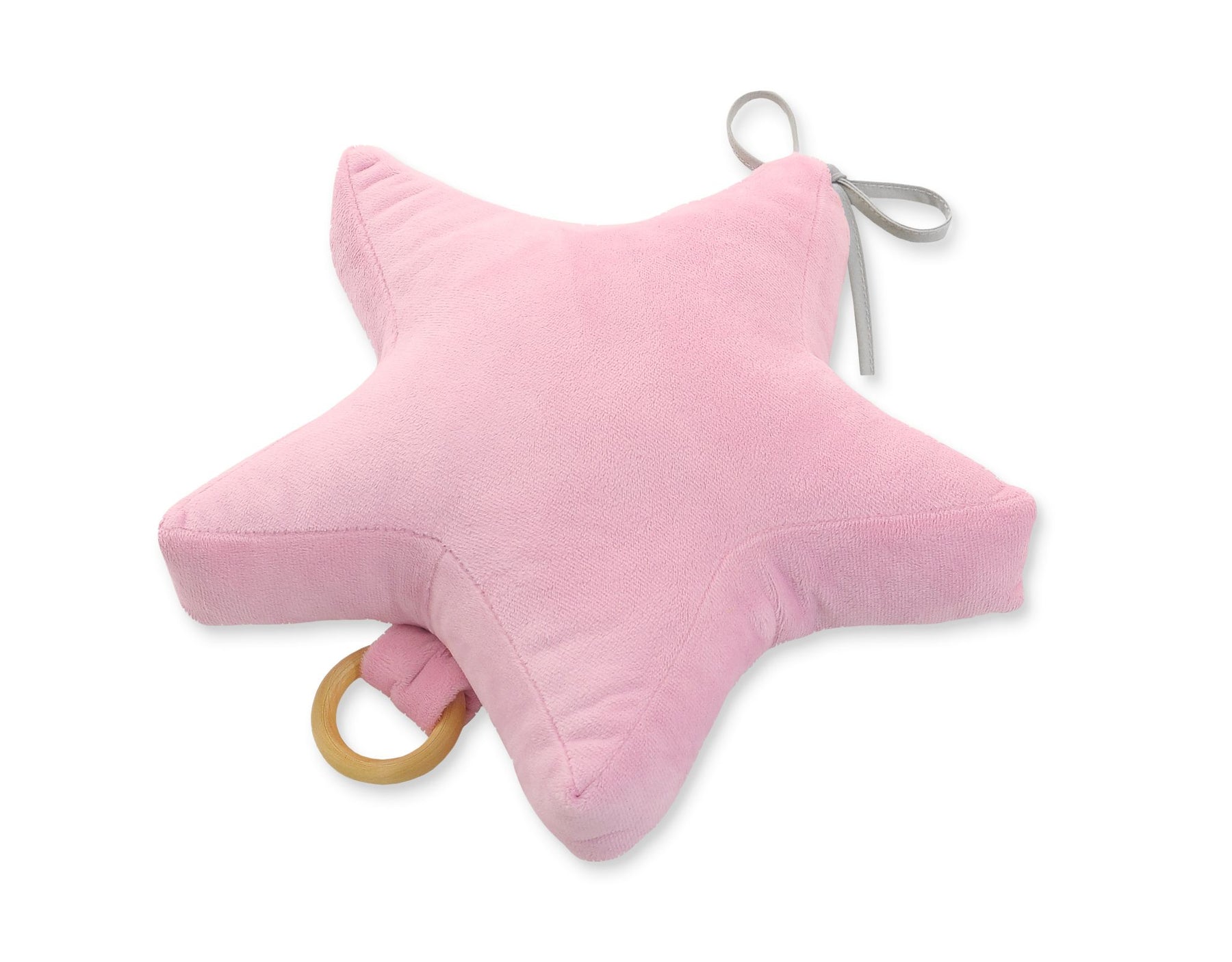 Muziekdoos voor baby's - een zachte ster. Een mooie muziekdoos met een delicate melodie zal het voor de baby gemakkelijker maken om in slaap te vallen, het zal ook een mooie decoratie zijn voor de kinderkamer. Gemaakt van zachte, gladde Minky. De vulling bestaat uit anti-allergische vezels - siliconen balletjes zonder optische witmakers. Het mechanisme van de muziekdoos is bevestigd aan een beukenhouten ring.