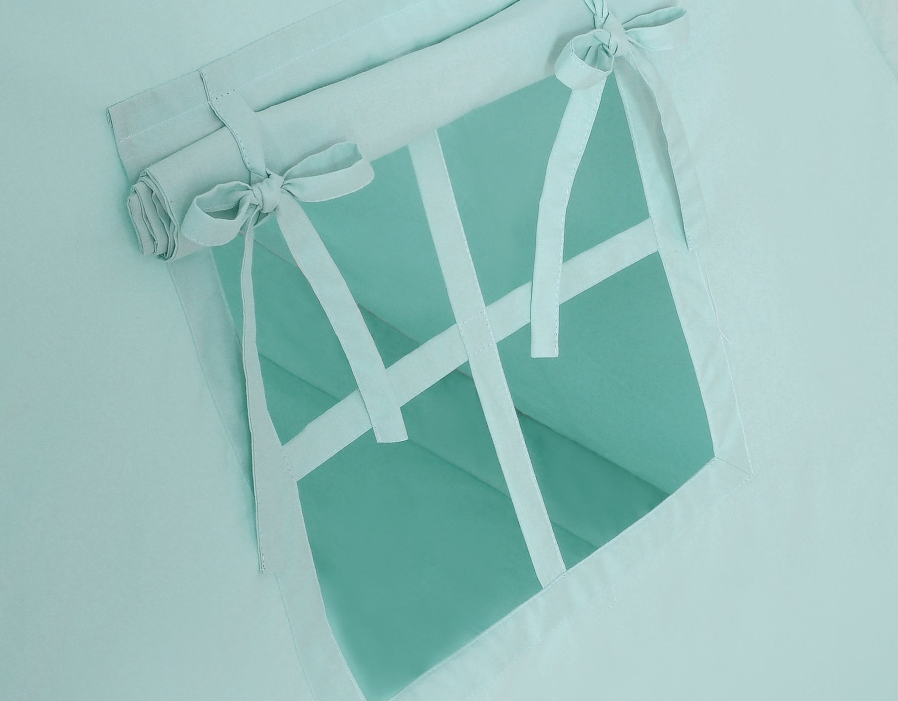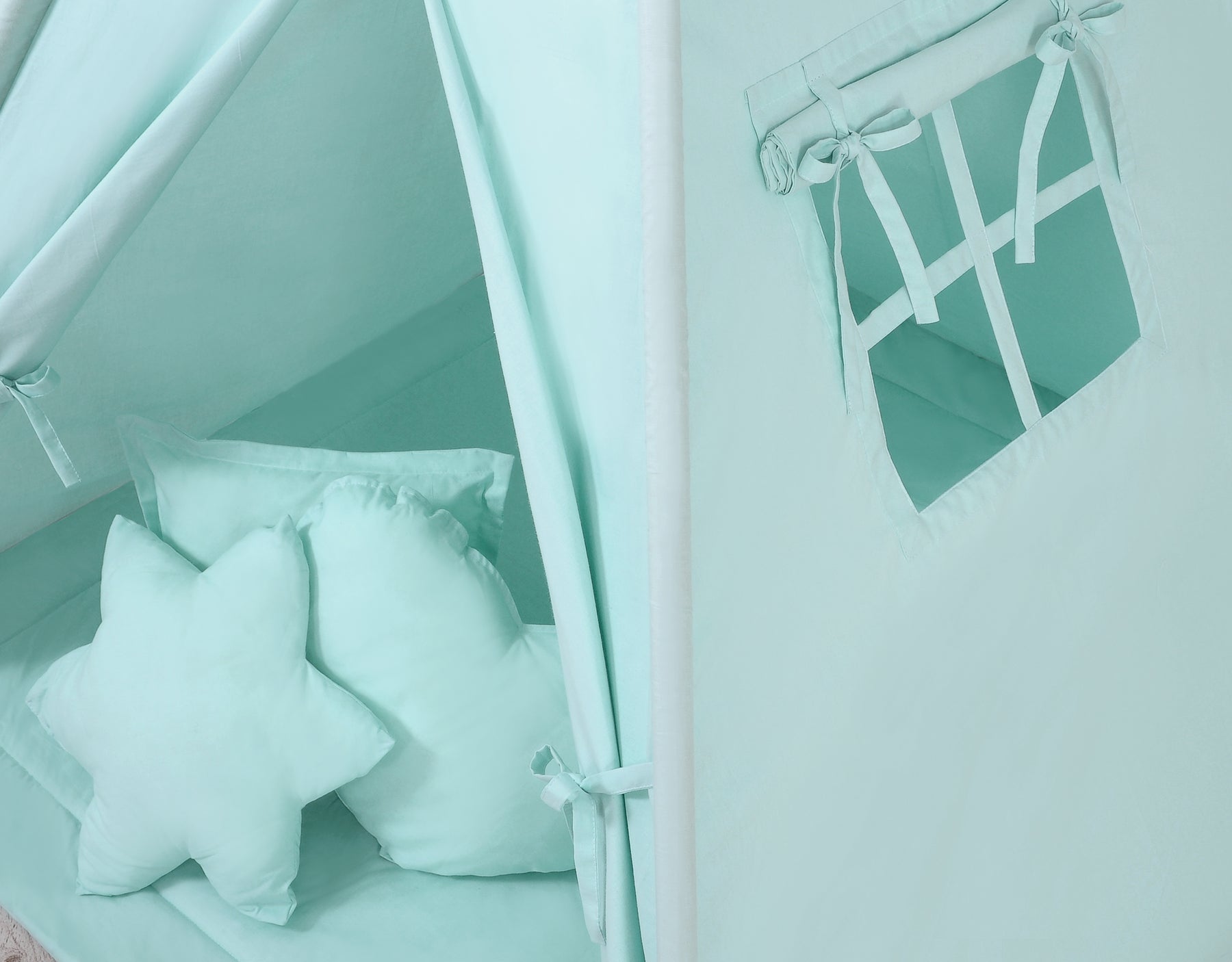 Er zit een raam met een gordijn in de zijwand van de tent, en de ingang van de tent is voorzien van speciale banden die vastgebonden kunnen worden zodat het kind vrije doorgang heeft in en uit de tent. Zodra de gordijnen bij de ingang zijn neergelaten, kan de tent een ideale verstopplek bieden tijdens het spelen.